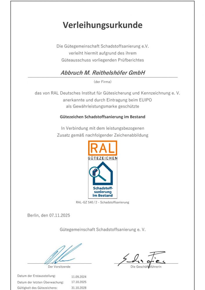 Unsere Poliere, Maschinisten und Facharbeiter garantieren die adäquate Umsetzung auf der Baustelle. Laufende Weiterbildung, beispielsweise im Umgang mit Asbest nach TRGS 519 und für Arbeiten in kontaminierten Bereichen nach DGUV (BGR 128), runden die baufachlichen Qualifikationen unserer Mitarbeiter ab.